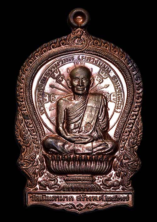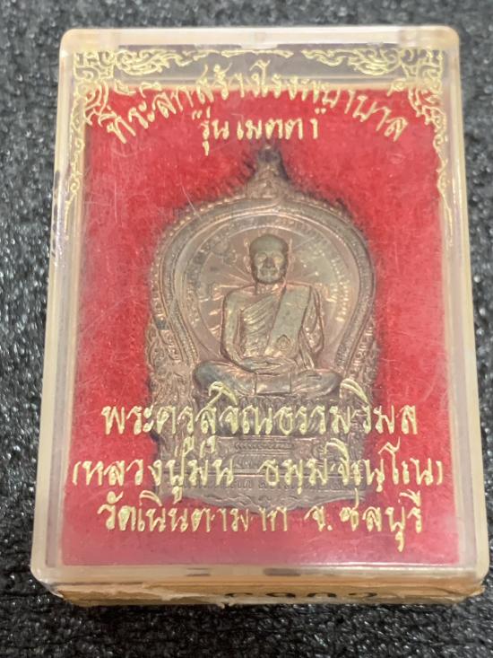 เหรียญนั่งพาน รุ่นเมตตา หลวงปู่ม่น วัดเนินตามาก ชลบุรี พิธีใหญ่ปี37 เนื้อนวะโลหะ เลข 6902 สวยมาก มีกล่องเดิมครับ |