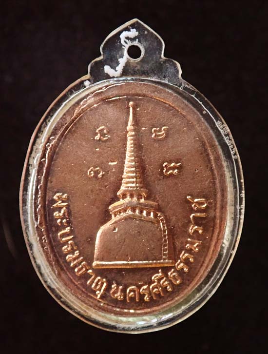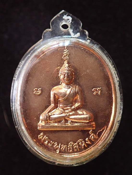 เหรียญพระพุทธสิหิงค์ หลังพระบรมธาตุนครศรีธรรมราช (พิมพ์กรรมการ) ปี 2517 (พิธีพุทธาภิเษกใหญ่ ในหลวงเสด็จในพิธี อจ.นำ,ลป.หมุน,ครูกาแก้ว ฯลฯ ปลุกเสก) เนื้อทองแดงผิวไฟ สวยมาก เลี่ยมพลาสติกเก่า