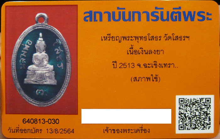 หรียญหลวงพ่อโสธร เนื้อเงินลงยาสีเขียว ปี2513 ยาเต็ม สร้างน้อยหายาก พร้อมบัตรรับรอง