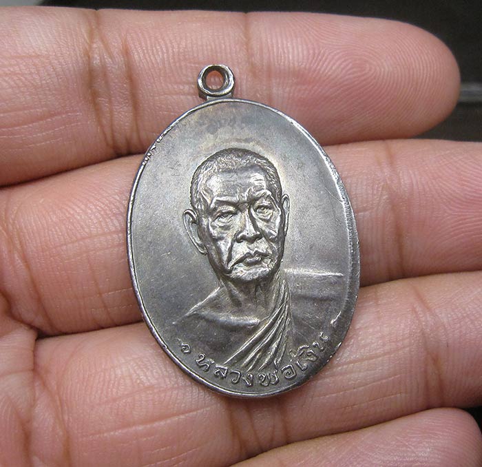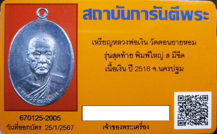 เหรียญหลวงพ่อเงิน วัดดอนยายหอม รุ่นสุดท้าย พิมพ์ใหญ่ เนื้อเงิน บล็อคนิยม ส มีขีด ปี2518 จ.นครปฐม พร้อมบัตรรับรอง
