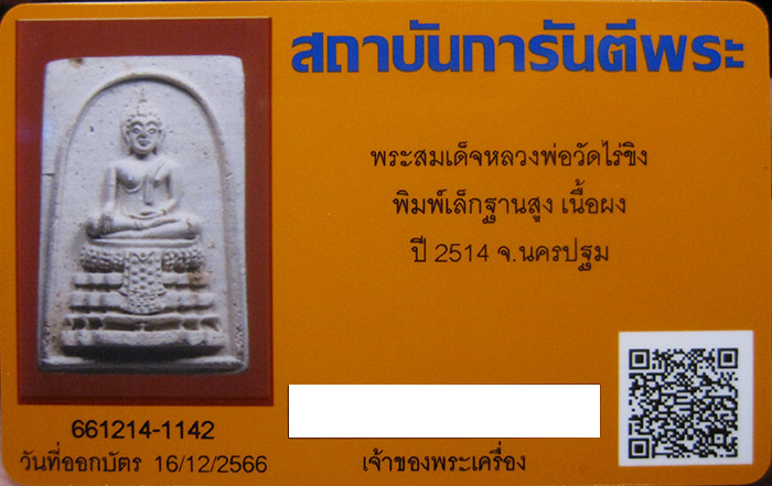 พระสมเด็จหลวงพ่อวัดไร่ขิง พิมพ์เล็กฐานสูง(นิยม) เนื้อผง ปี2514 จ.นครปฐม สภาพสวย พร้อมบัตรรับรอง