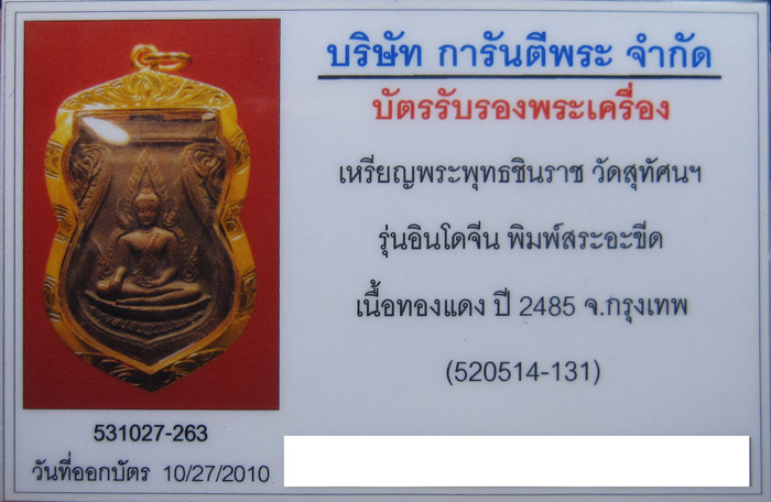 เหรียญพระพุทธชินราช วัดสุทัศนฯ รุ่นอินโดจีน พิมพ์สระอะขีด เนื้อทองแดง ปี 485 กรุงเทพฯ พร้อมบัตรรับรอง