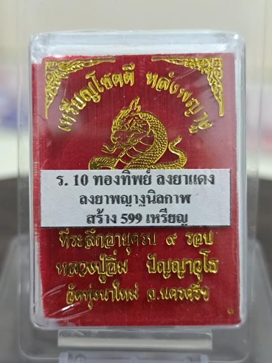 เหรียญโชคดี หลังพญางู วาระ ๙ รอบ หลวงปู่อิ่ม ปญฺญาวุโธ วัดทุ่งนาใหม่ จ.นครศรีธรรมราช (ขนาดเหรียญ 3.0 ซม.) เนื้อทองทิพย์ลงยาแดง ลงยาพญางูเพลิง ซีลเดิม ลุ้นเลขสวย/เลขมงคลครับ (1)