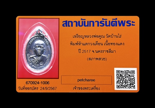 หลวงพ่อคูณ วัดบ้านไร พิมพ์นิยมรุ่นปี 2517 บล๊อกห้าแตกวงเดือน บล๊อกนิยมขวัญใจมหาชนของนักสะสม ผิวปรอทสวย จมูก หน้าผากมีผิวเกินสวยมาก มาพร้อมบัตรรับรองสภาพสวย ยินดีรับประกันตามกฏ