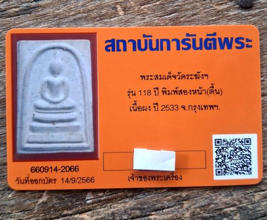 สมเด็จวัดระฆัง อนุสรณ์ 118 ปี พิมพ์กรรมการสองหน้า "หน้าพิมพ์ใหญ่ หลังพิมพ์รูปเหมือน" ออกปี 2533 พร้อมบัตรรับรอง |