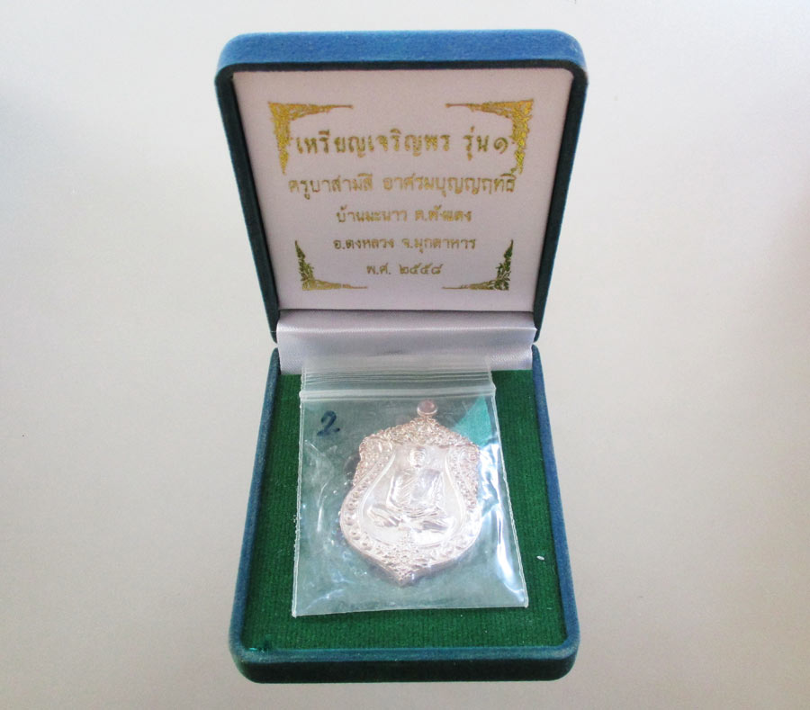 เหรียญเสมา รุ่น 1 ครูบาสามสี อาศรมบุญญฤทธิ์ จ.มุกดาหาร พ.ศ.2 558 เนื้อเงิน ตอกโค๊ต ตอกเลข สภาพสวยเดิมพร้อมกล่องเดิม |