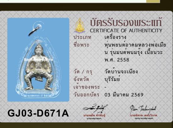 หุ่นพยนต์หลวงพ่อเมียน วัดบ้านจะเนียง เนื้อนวะพรายเงิน ปี 2558 พร้อมบัตรรับรองสมาคม