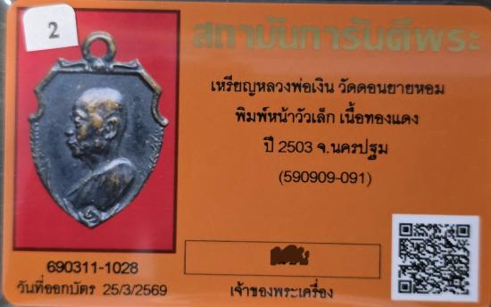 เหรียญหลวงพ่อเงิน วัดดอนยายหอม หน้าวัว พิมพ์นิยมมีเลขหนึ่งหายากครับ พร้อมบัตรครับ