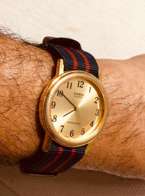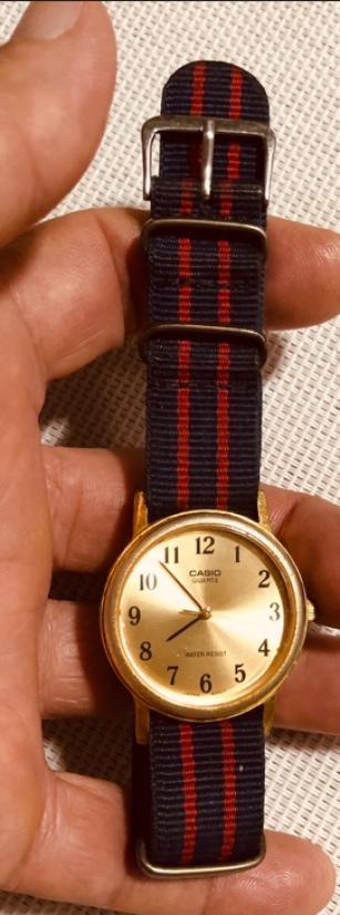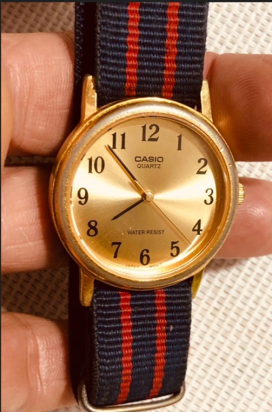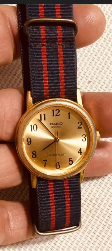 ???...CASIO QUARTZ WATER RESIST เรือนทอง สายผ้า ดำแดง...??? |