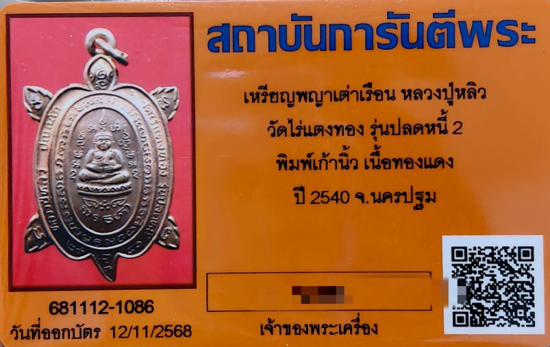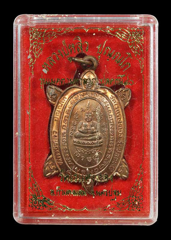 เหรียญพญาเต่าเรือน หลวงปู่หลิว วัดไร่แตงทอง รุ่นปลดหนี้2 พิมพ์เก้านิ้ว ปี2540 จ.นครปฐม กล่องเดิม +บัตรรับรอง
