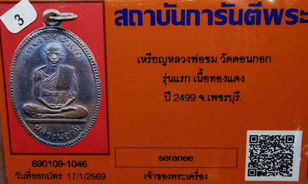เหรียญหลวงพ่อชม วัดดอนกอก รุ่นแรก เนื้อทองแดง ห่วงเดิม ปี2499 จ.เพชรบุรี + บัตรG-pra สภาพเดิมค่ะ