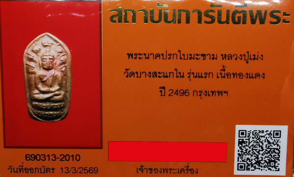 พระนาคปรกใบมะขาม หลวงปู่เม่ง วัดบางสะแกใน เนื้อทองแดง ปี2496 จ.กรุงเทพฯ + บัตรG-pra สภาพเดิมค่ะ |
