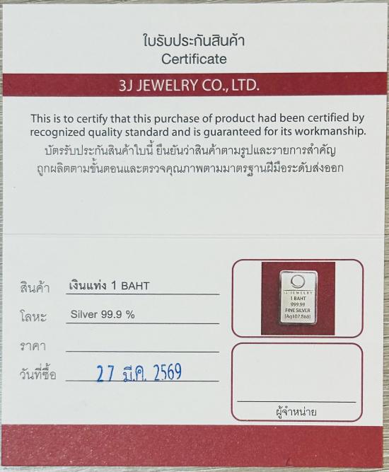 เงินแท่ง ร้านดัง 3J Jewelry พร้อมบัตรรับประกันสินค้า ร้านดังคุณภาพส่งออก