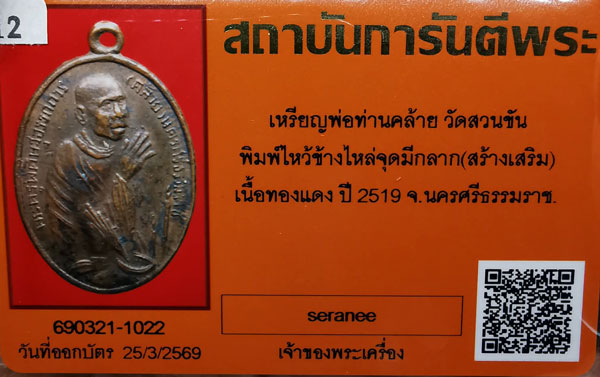 เหรียญพ่อท่านคล้าย วัดสวนขัน พิมพ์ไหว้ข้างมีกลากสร้างเสริม(ตอก2โค๊ต) เนื้อทองแดง ปี2519 จ.นครศรีธรรมราช + บัตรG-pra สภาพเดิมค่ะ