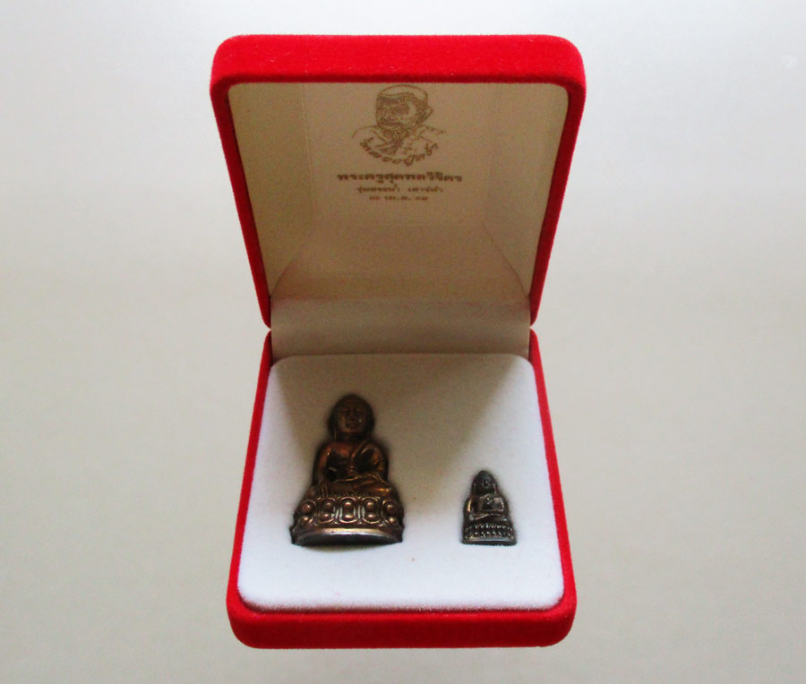 ชุดพระกริ่งและพระชัยวัฒน์ หลวงปู่คร่ำ วัดวังหว้า จ.ระยอง รุ่นสรงน้ำเสาร์ 5 พ.ศ.2537 เนื้อนวะโลหะเต็มสูตรก้นแผ่นเงิน ตอกโค๊ต ตอกเลข สภาพสวยนอนนิ่งกล่องกำะหยี่สีแดงเดิมๆ !!