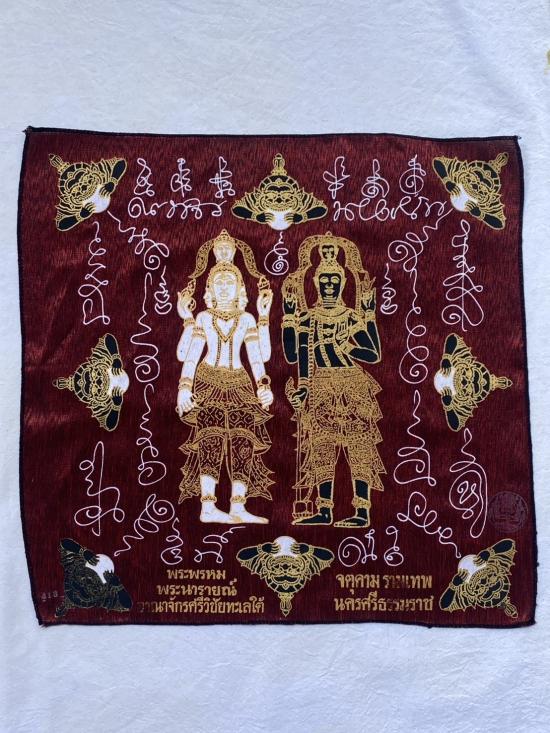 เคาะเดียวแดง ผ้ายันต์ พระพรหม พระนารายณ์ มิ่งมงคล รุ่นมงคลจักวาล ขนาด40/40ซม สีแดง มีตราประทับ-มีรันเลข |