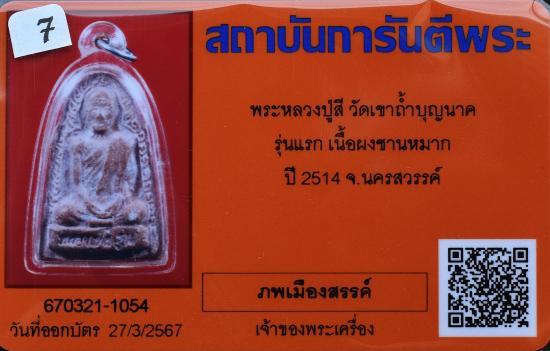 พระผงรูปเหมือนหลังยันต์ รุ่นแรก เนื้อผงชานหมาก ปี 2514 หลวงปู่สี วัดเขาถ้ำบุญนาค จ.นครสวรรค์ เลี่ยมพลาสติก มาพร้อมบัตรรับรองพระแท้การันตีพระ สภาพพระตามรูปที่ลงทุกประการ