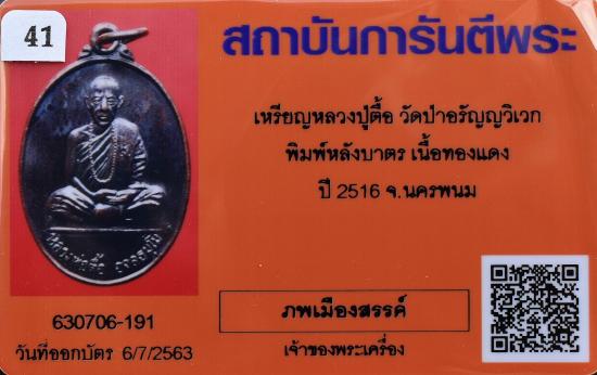 ( 41 ) เหรียญหลวงปู่ตื้อ อจลธมฺโม วัดป่าอรัญญวิเวก พิมพ์หลังบาตร เนื้อทองแดง ปี 2516 จ.นครพนม + บัตรรับรองพระแท้การันตีพระ