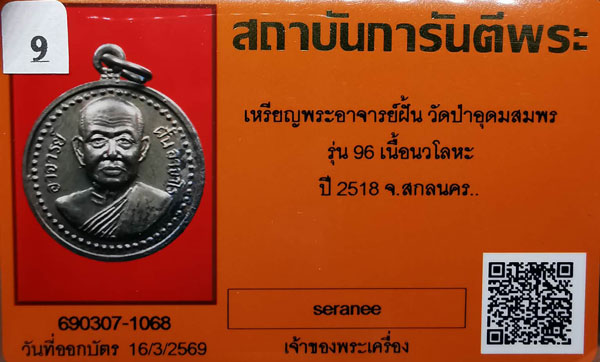 เหรียญพระอาจารย์ฝั้น วัดป่าอุดมสมพร รุ่น96 เนื้อนวโลหะ ห่วงเดิม ปี2518 จ.สกลนคร + บัตรG-pra สภาพเดิมค่ะ