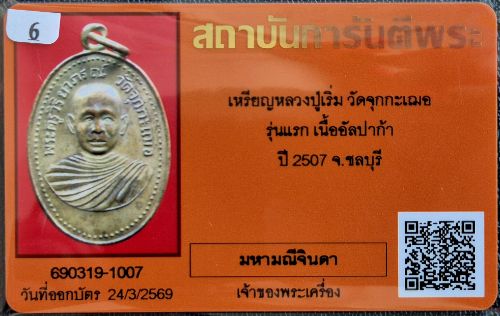 เหรียญหลวงพ่อเริ่ม วัดจุกกะเฌอ รุ่นแรก ปี 2507 เนื้ออัลปาก้า พร้อมบัตรรับรองครับ
