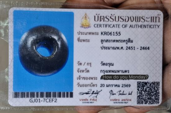 ลูกสะกดพระครูลืม วัดอรุณ พร้อมบัตรรับรองสมาคม