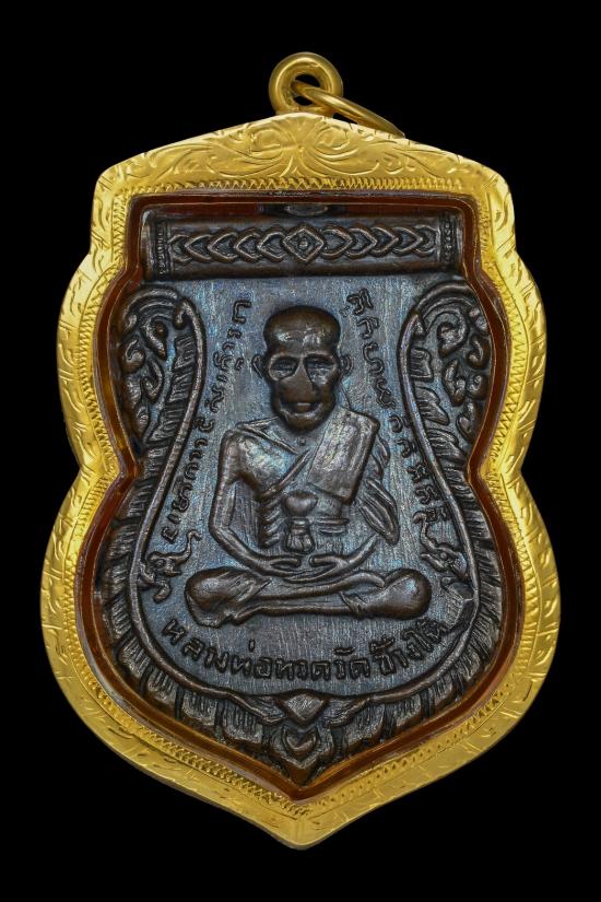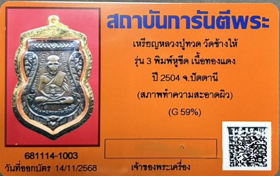 เหรียญหลวงปู่ทวด วัดช้างให้ รุ่น 3 พิมพ์เสมาหูขีด เนื้อทองแดง ปี 2504 เลี่ยมทอง พร้อมบัตรรับรอง