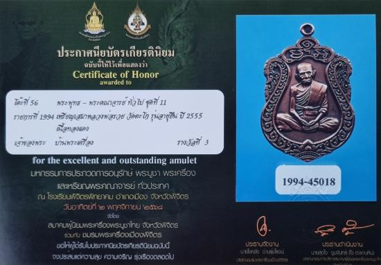เหรียญเสมาหลวงพ่อรวย วัดตะโก รุ่นอายุยืน ปี 2555 เนื้อทองแดง พร้อมใบประกาศติดรางวัลที่ 3 งานจังหวัดพิจิตร (งานสมาคมฯ)