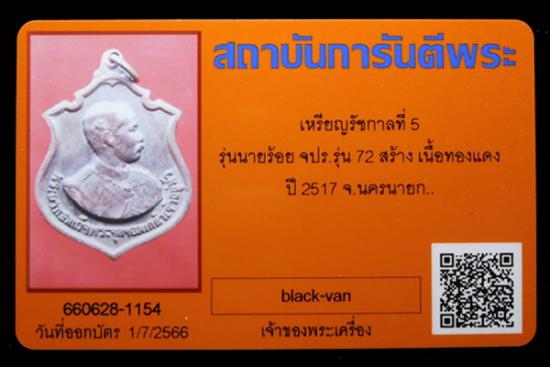 เหรียญ ร.๕ คณะนักเรียนนายร้อยจปร. รุ่น ๗๒ จัดสร้าง ปี ๒๕๑๗ เนื้อทองแดง พร้อมบัตรรับรอง G-pra ครับ