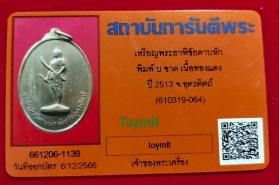 เหรียญพระยาพิชัยดาบหักปี 13 บล็อกนิยม "บ ขาดนิยมสวยมี(ไหลน้ำทอง)หายากพร้อมบัตรครับ