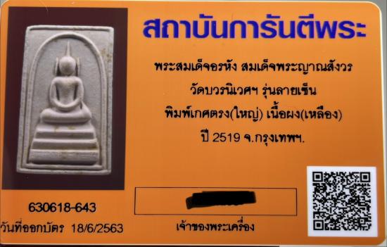 สมเด็จอรหัง สมเด็จพระญาณสังวร วัดบวรฯ พิมพ์หลังลายเซ็น(ใหญ่) เนื้อผง(เหลือง) ปี2519 |
