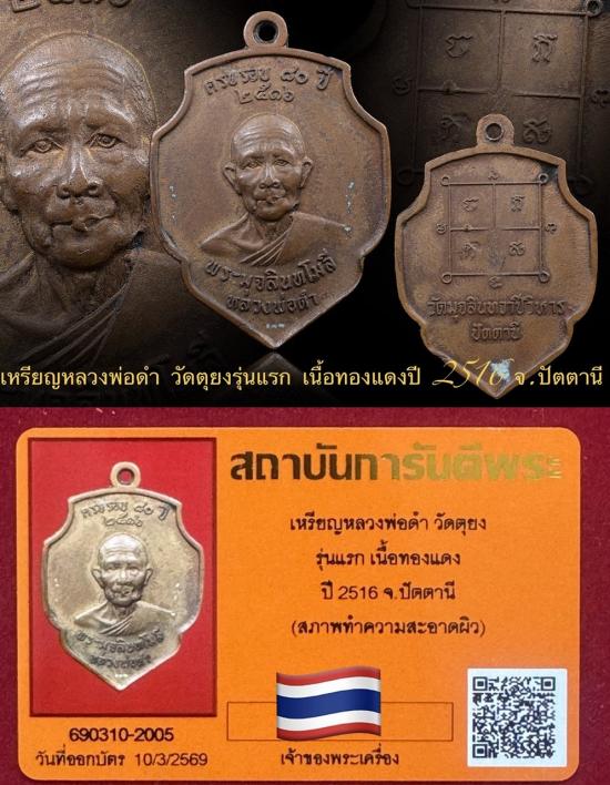 เหรียญรุ่นแรกหลวงพ่อดำ วัดตุยง ปัตตานี เนื้อทองแดง"ไม่รมดำ"ปี 2516 เป็นเหรียญที่หายากและพบเจอน้อยครับ "บัตรลงทำความสะอาดผิว" พระคมชัดและมีทองคำติดเดิมมาตั้งแต่ยุคแรกครับ รับประกันแท้และตามกฎ
