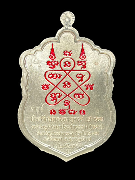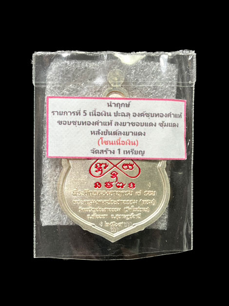 เสมา 7 รอบ พระครูมงคลประชาธรรม วัดในปราบ จ.สุราษฎร์ธานี นำฤกษ์ รายการที่ 5 เนื้อเงิน ปะฉลุ องค์ชุบทองคำแห้ ขอบชุบทองคำแท้ ลงยาขอบแดง ซุ้มแดง หลังยันต่ลงยาแดง(โซนเนื้อเงิน) จัดสร้าง 1 เหรียญ หมายเลข 1