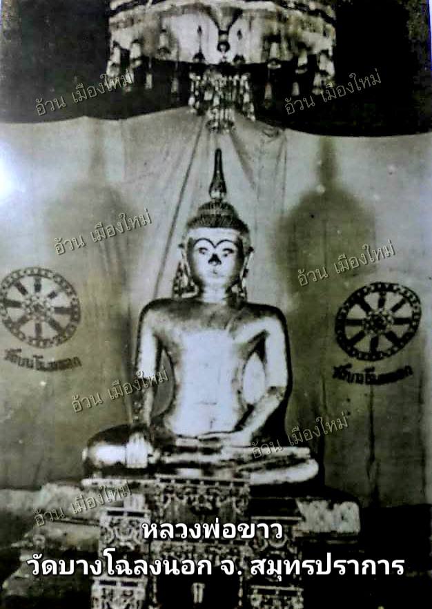 ++ประวัติ : หลวงพ่อขาว วัดบางโฉลงนอก อ.บางพลี จ.สมุทรปราการ เป็นพระพุทธรูปปางมารวิชัย นั่งขัดสมาธิราบ ศิลปแบบ อยุธยา ตอนปลาย เดิมเป็นปูนปั้นสีขาว จึงเรียกหลวงพ่อขาว พระพักตร์ ลักษณะกลมแป้น พระขนงโค้ง พระนาสิก และพระโอษฐ์เล็ก พระวรกายสะโอดสะอง แบบอยุธยาตอนปลาย ปลายสังฆาฏิจรดพระนาภี อยู่กึ่งกลางพระวรกายซึ่งเป็นที่นิยมช่วงอยุธยาตอนปลาย สมัยก่อนหลวงพ่อขาวเดิมประดิษฐาณบนศาลาเก่าแก่ประเภทพุพัง แดดส่อง ฝนรั่ว ต่อมาเมื่อปี พ.ศ.2499 สมัย พระครูวนัยธรจวง สร้างอุโบสถหลังใหม่เสร็จจึงได้ย้ายหลวงพ่อไปประดิษฐาณไว้ จนถึงปัจจุบัน