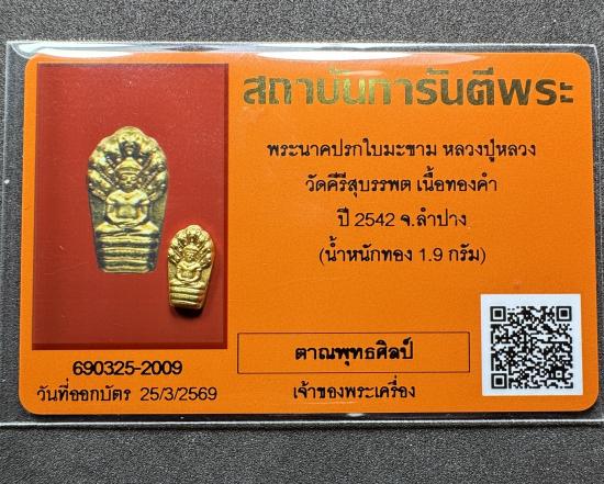 พระนาคปรกใบมะขาม หลวงปู่หลวง วัดคีรีสุบรรพต เนื้อทองคำ ปี 2542 จ.ลำปาง (น้ำหนักทอง 1.9 กรัม)