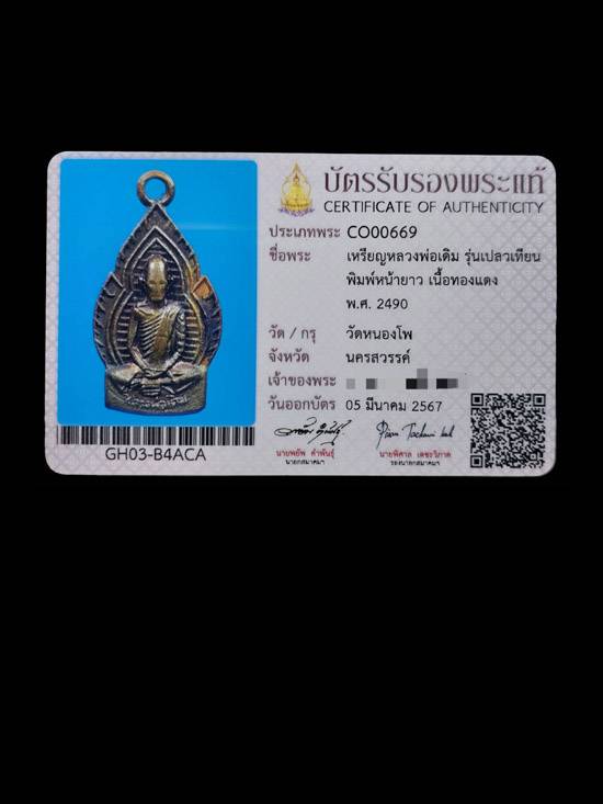 เหรียญเปลวเทียน หลวงพ่อเดิม วัดหนองโพ ปี2490 (พิมพ์หน้ายาว) พร้อมบัตรสมาคม