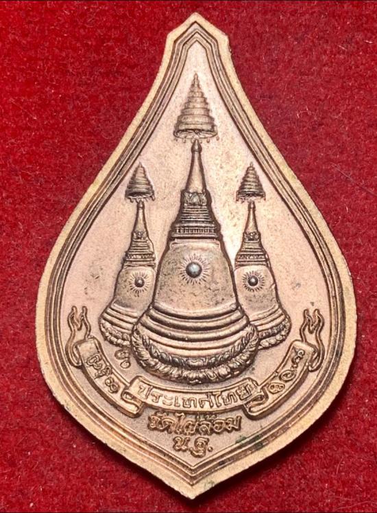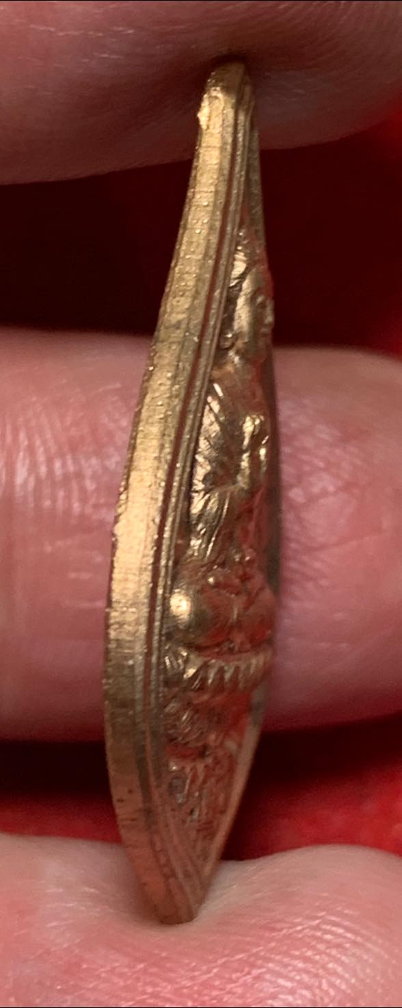 ลักษณะ: เหรียญโลหะทรงหยดน้ำ แกะสลักรูปพระพุทธรูปปางมารวิชัยบนฐานบัว