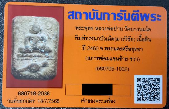 พระพุทธ หลวงพ่อปาน พิมพ์ทรงนกบัวเม็ด(มารวิชัย) มีบัตรรับรอง