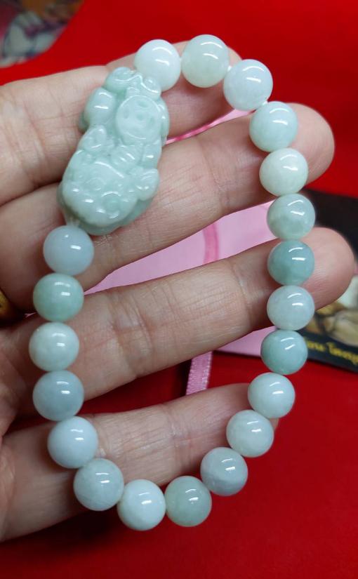 ***วัดใจ***สร้อยข้อมือปี่เซี๊ยะ หินหยกพม่า สีพาสเทล (Pastel Jade) 8 มิล กับถุงเหนี่ยวทรัพย์ วัดอาวุธฯ พร้อมการ์ดใบคาถา