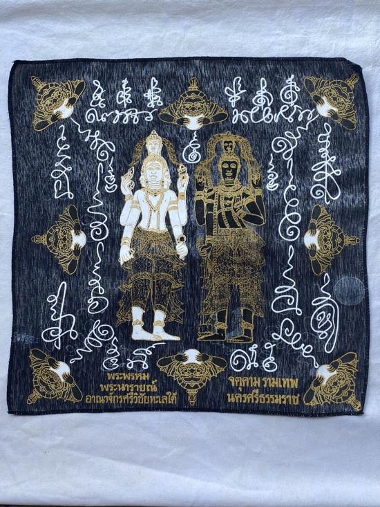 เคาะเดียวแดง ผ้ายันต์ พระพรหม พระนารายณ์ มิ่งมงคล รุ่นมงคลจักวาล ขนาด40/40ซม สีดำ มีตราประทับ-มีรันเลข |