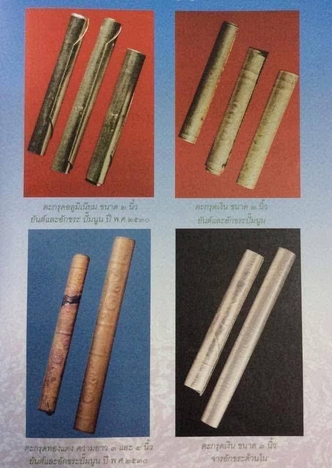 ตะกรุดของท่านท่านได้สร้างในรูปแบบต่างๆๆ ตั้งแต่ช่วงสงครามอินโดจีน ท่านจะทำแจกให้ลูกศิษย์ โดยทั่งไปขนาดจะไม่แน่นอน ในช่วงแรกๆๆท่านจะใช้โลหะที่มีอยู่ที่วัด เช่น ทองเหลืองฝาบาตร ทองเหลืองเลี่ยมหัวเรือ แผ่นทองแดง แผ่นตะกั่ว อลูมิเนีนม สังกะสี สแตนเลส ถ้าลูกศิษย์คนใดนำโลหะมาท่านก็จะเมตตาจารให้ บางคนก็ก็นำแผ่นทองคำมาให้