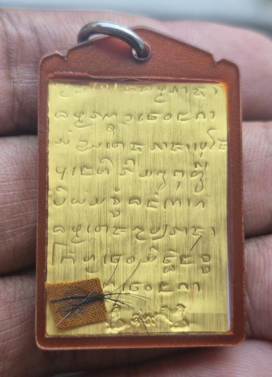 รุปถ่ายอัดกระจก พระอาจารย์ราชัน วัดพระธาตุจำม่วง ฉากเหลือง หลังแผ่นทองคำ มีจารมือเกศาจีวร เลข19 เลี่ยมกรอบโบราณ