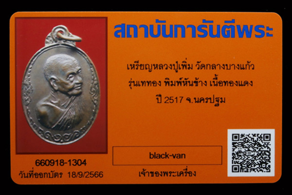 เหรียญเททอง พิมพ์หันข้าง หลวงปู่เพิ่ม วัดกลางบางแก้ว เนื้อทองแดง ปี2517 พร้อมบัตรรับรอง G-pra ครับ