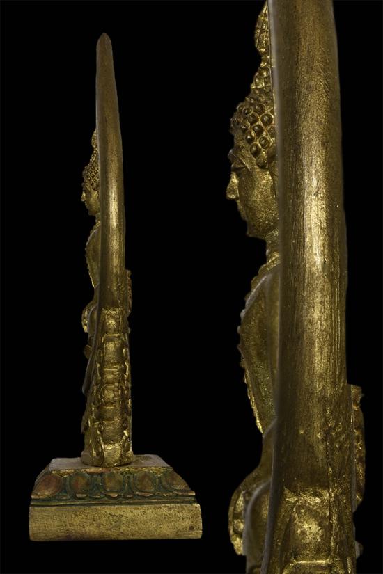 ลักษณะเป็นแผ่นหล่อโบราณ เน้อทองผสม ฐานแยกชิ้น สูงประมาณ 4 นิ้วรวมฐาน ฐานกว้างประมาณ 2.5 นิ้ว สวยมาก หายากแน่นอน ตั้งบูชาชุดเล็กน่ารักไว้ร้านค้า หรือไว้หน้ารถ ก็เหมาะมากๆครับ |