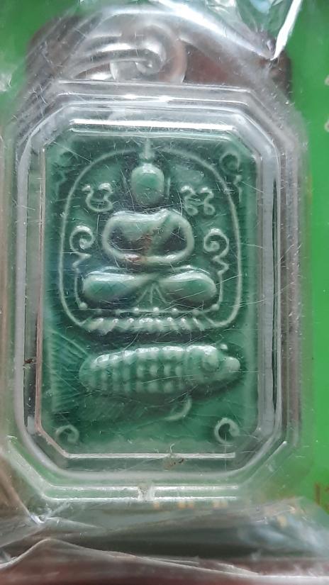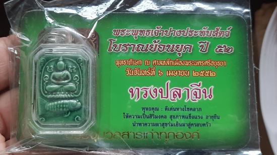 พระพุทธเจ้าปางประทับสัตว์ โบราณย้อนยุค ปี2552 (เนื้อดินเผาเคลือบสีเขียว ผสมมวลสารเก่า พิมพ์ทรงปลาจีน) ยังไม่แกะซอง |