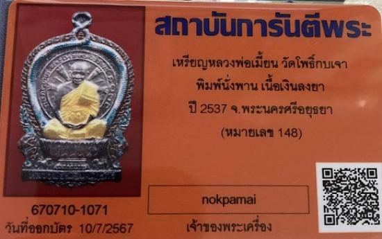 เหรียญหลวงพ่อเมี้ยน นั่งพานเนื้อเงินลงยา วัดโพธิ์กบเจา เบอร์ 148 ปี2537สร้างเพียง295พร้อมกล่องเดิมสวยๆๆ หายากคับ