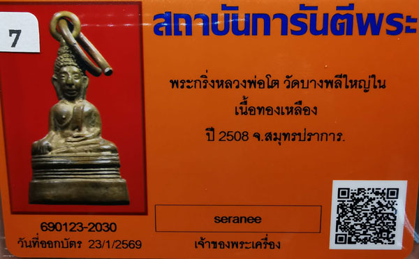 พระกริ่งหลวงพ่อโต วัดบางพลีใหญ่ใน พิมพ์มีหู เนื้อทองเหลือง ห่วงเดิม ปี2508 จ.สมุทรปราการ + บัตรG-pra สภาพเดิมค่ะ
