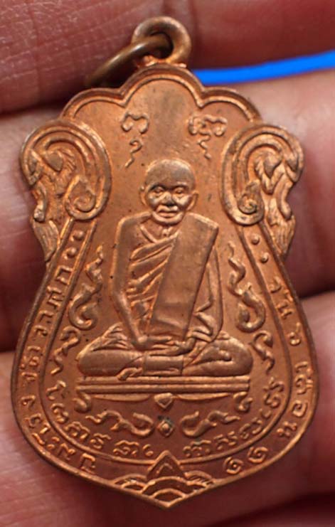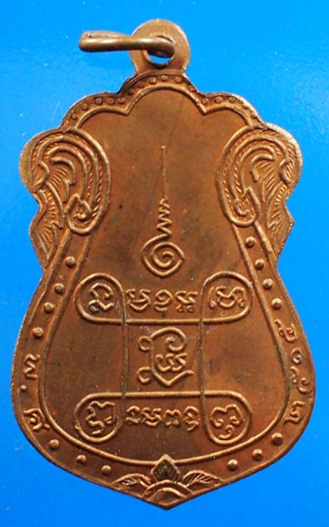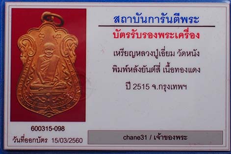 เหรียญหลวงปู่เอี่ยม วัดหนัง พิมพ์หลังยันต์สี่ เนื้อทองแดง ปี 2515 จ.กรุงเทพ พร้อมบัตรรับรองสถาบันการันตีพระ