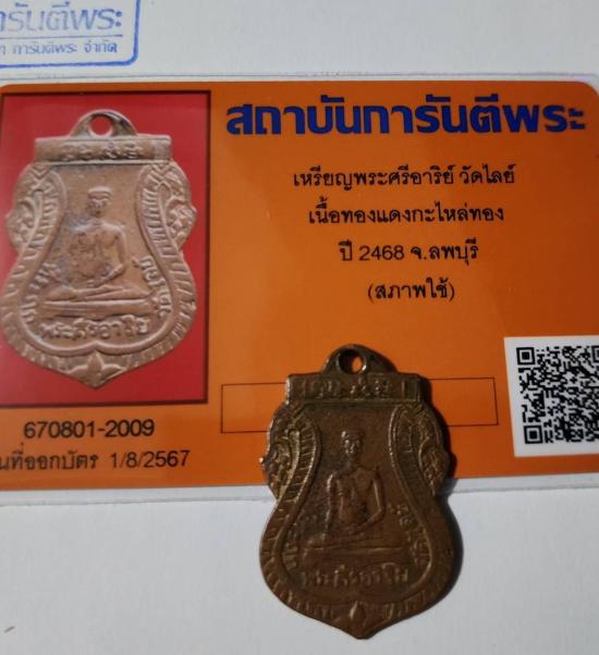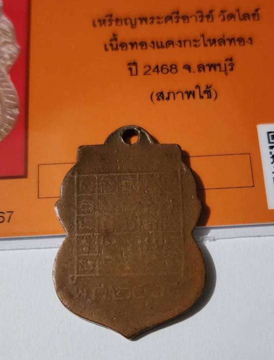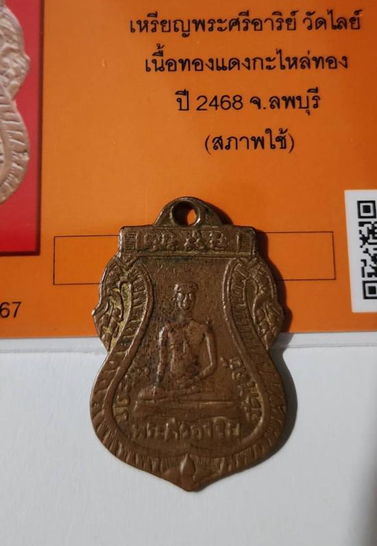 ((หายาก ปี 2468)) เหรียญพระศรีอาริย์ วัดไลย์ เนื้อทองแดงกะไหล่ทอง ปี 2468 พร้อมบัตรรับรองอุ่นใจไม่ต้องวัดใจสภาพพระแท้