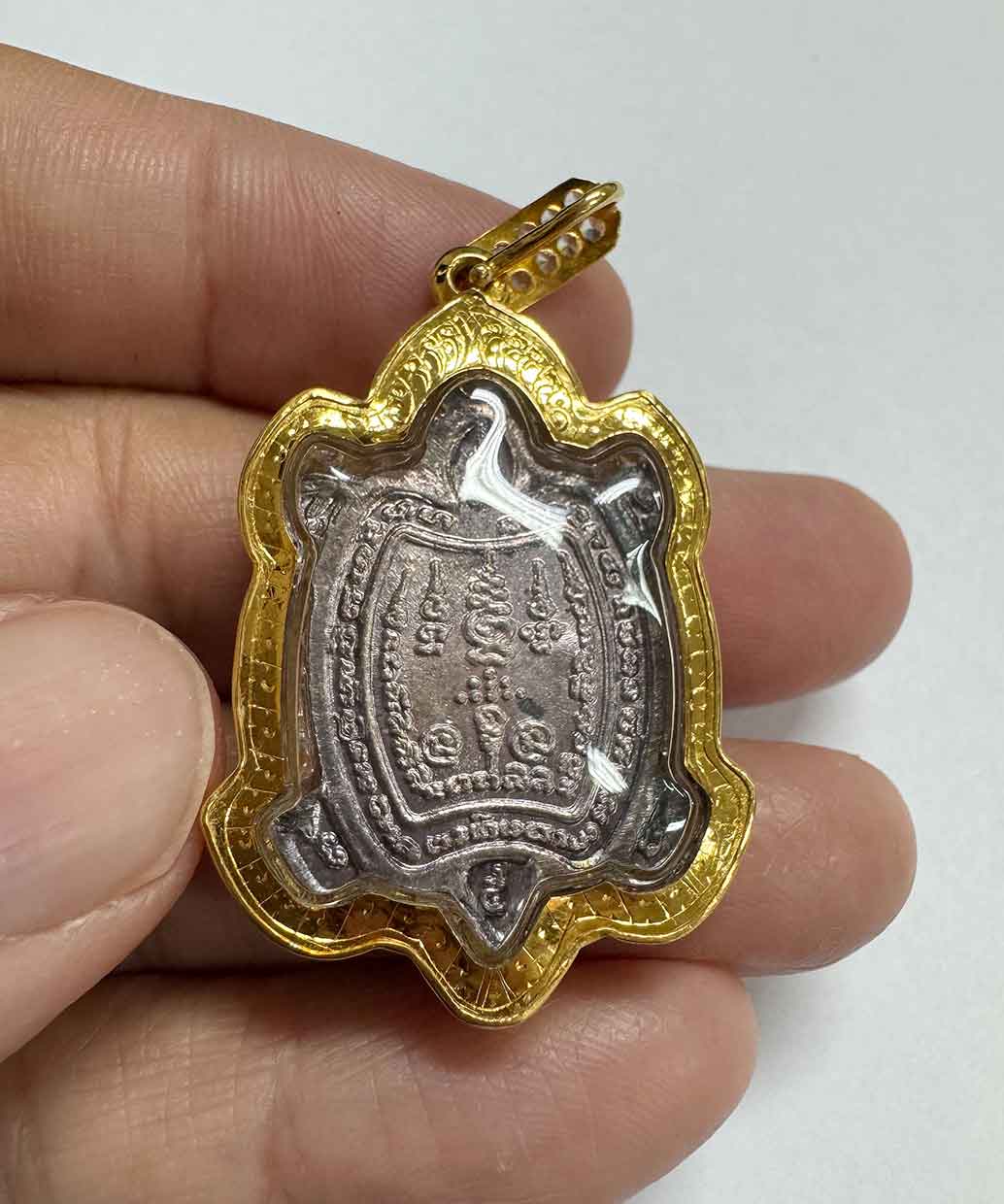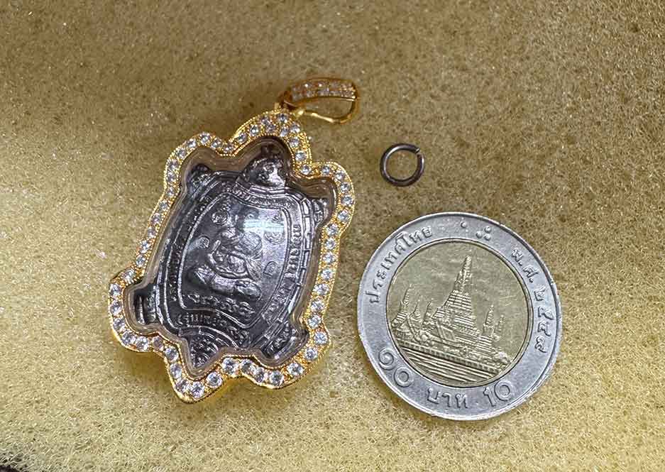 **เหรียญพญาเต่าเรือน หลวงปู่หลิว วัดไทรทอง รุ่นแซยิด 90 ปี สร้างปี พ.ศ.2539 เนื้อเงิน ตอก 2 โค้ด โค้ด ลก(ภาษาจีน) และโค้ด ล. หายาก เลี่ยมทองคำแท้ ตอกโค๊ต80% ฝังเพชรCZ งานสวยเนียบ+พระผิวเดิมห่วงพระเดิมยังอยู่ แทบไม่ผ่านการใช้**