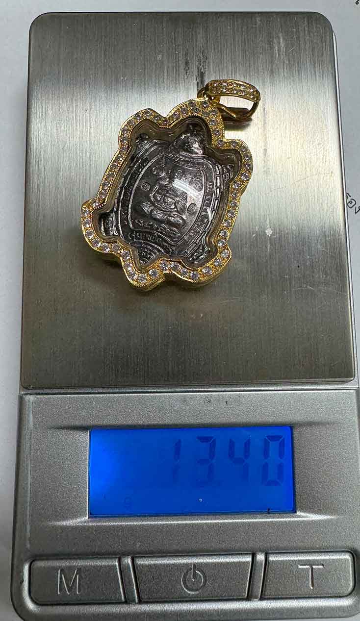 **เหรียญพญาเต่าเรือน หลวงปู่หลิว (นครปฐม)ออกวัดไทรทอง จ.กาญจนบุรี รุ่นแซยิด 90 ปี เนื้อเงิน เลี่ยมทองคำฝังเพชร**